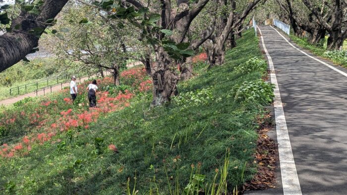 川沿いの1mぐらいのアスファルト道を走る。googleマップの推奨ルート。