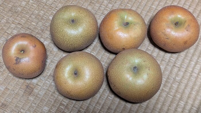買ってきた梨6個と、 すぐ食べるように1個もらった小さく傷ありの梨。
