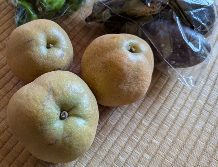 そして、作業テーブルの方に行って、梨を3つ差し出してくれた。