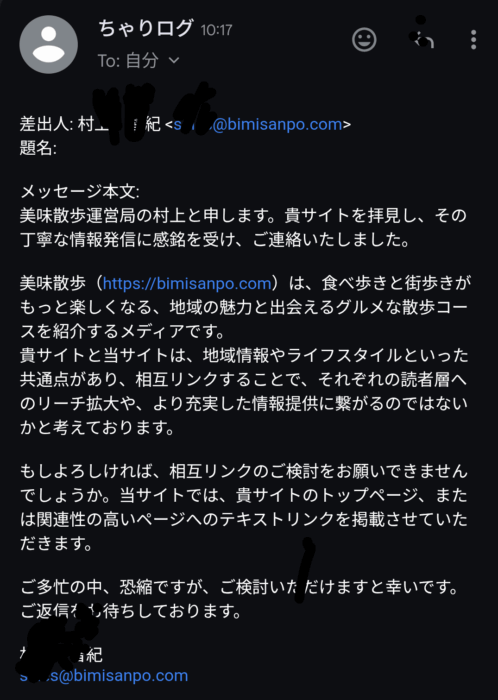 スマホをみたらメールが来ていた。ブログのお問い合わせフォームからだった。