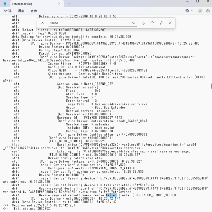 これかなと思う failed の近くに VEN_8086&DEV_A143 の文字列が