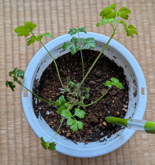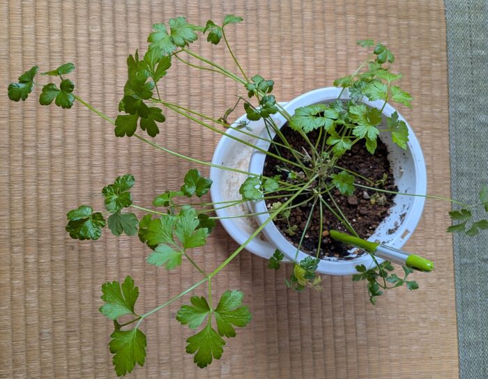 昼飯はイタリアンパセリを摘んで、ペペロンチーノにしようと思ったが、