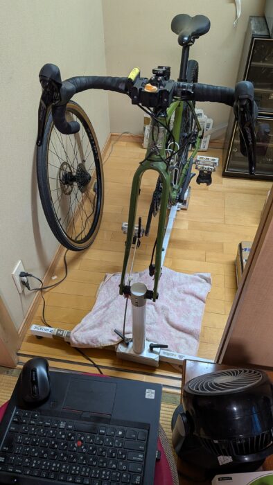 チェアを自転車の前に置いて、枕もとのwindows11ノートPC(thinkpad Ⅹ13)を乗せた。