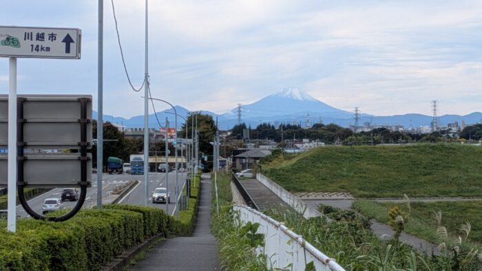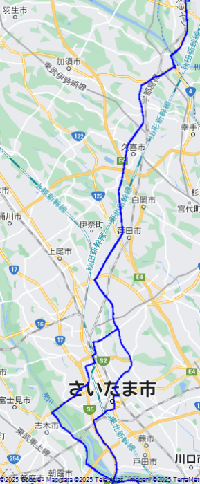 そこを経由するルートをPCのブラウザーから自転車navitimeで検索したら、先の入間大橋で荒川を渡るルートで61kmぐらいだったので、信号待ちを考えると、総距離で7、8kmの差であれば、総距離半分近く信号待ちがほぼ無い入間大橋が正解だな。