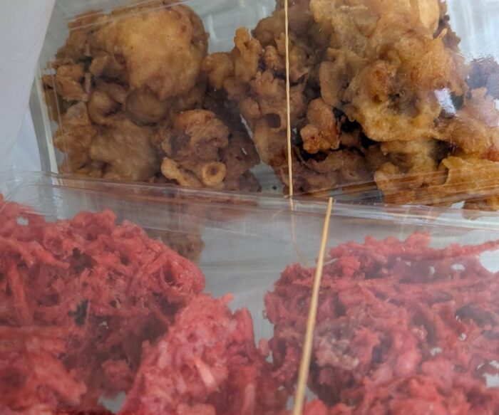 板橋の立ち食い蕎麦 そば谷の ゲソ天と紅ショウガ天をおみやげにした。