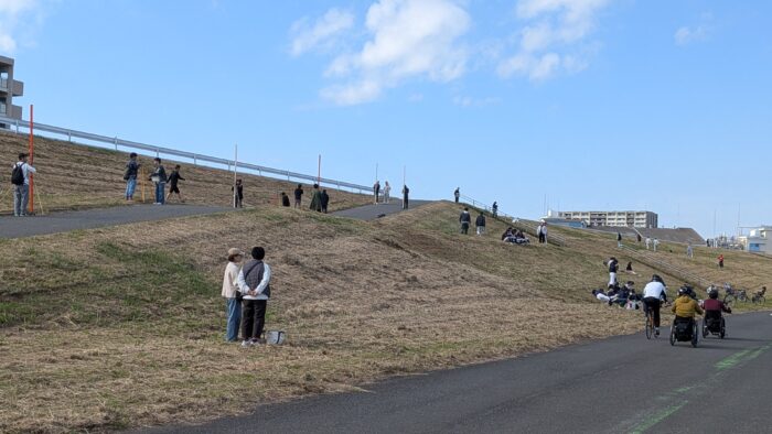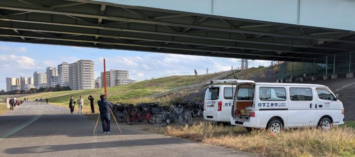 この土手の中段あたりに、三脚に載せた測量機器を除く人と長い棒を持って立っている