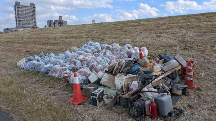 昨日、荒川クリーンエイドがいた場所に、ごみが集まっていた。