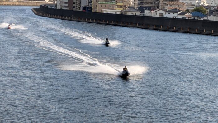 岩淵水門で休んでいたら、水上オートバイが2台曲がり角から見えて水門に近づいてくる。