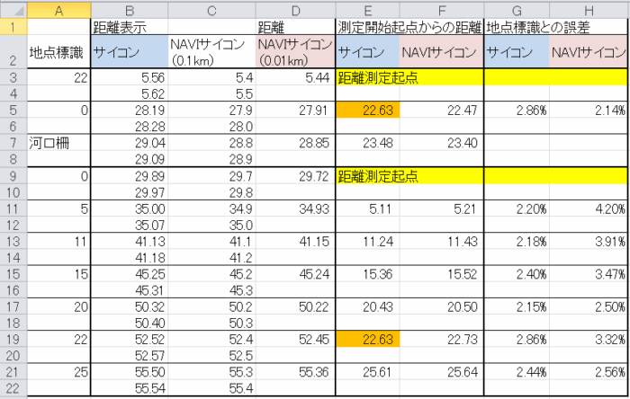 標識地点でのNAVIサイコンの0.01km精度の距離を算出した。