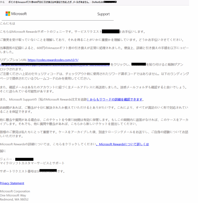 microsoft rewardポイントをamazonギフト券に引き換える申請がSMSメッセージが来ないために出来ずに