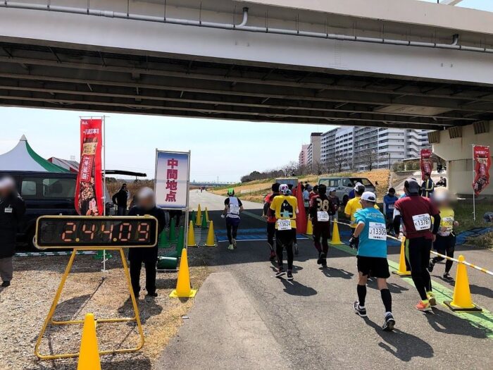 別のゲート写真で、シューズにつけたICチップを読み取るマットがゲートの前後にも複数枚あることが分かったが、多分42.195kmのコースでは、