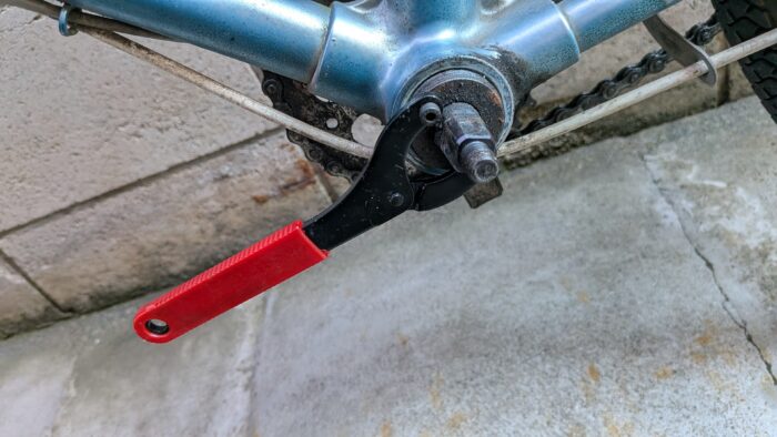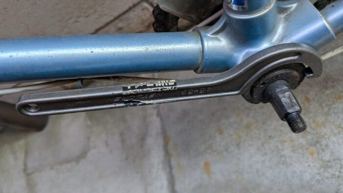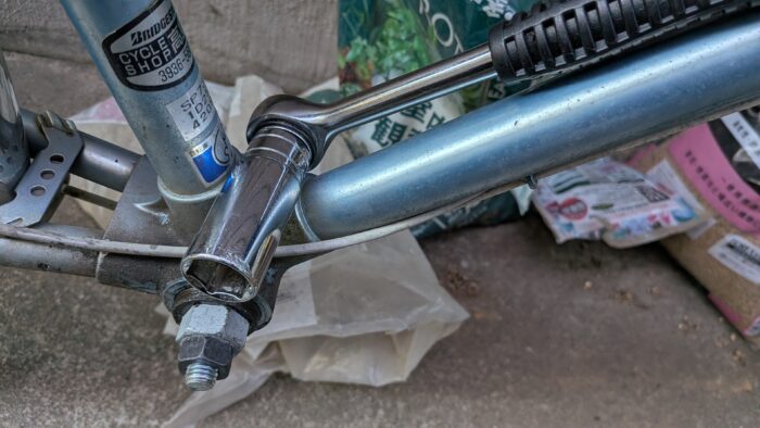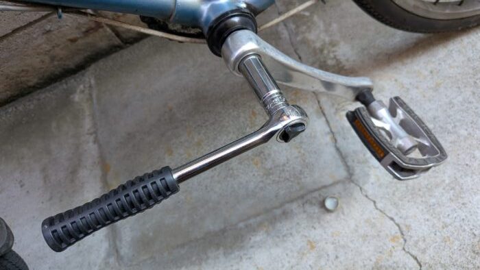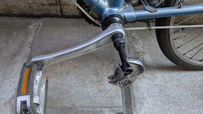 自転車工具セットのコッタレス抜き工具を使って、ペダルを引き抜く。