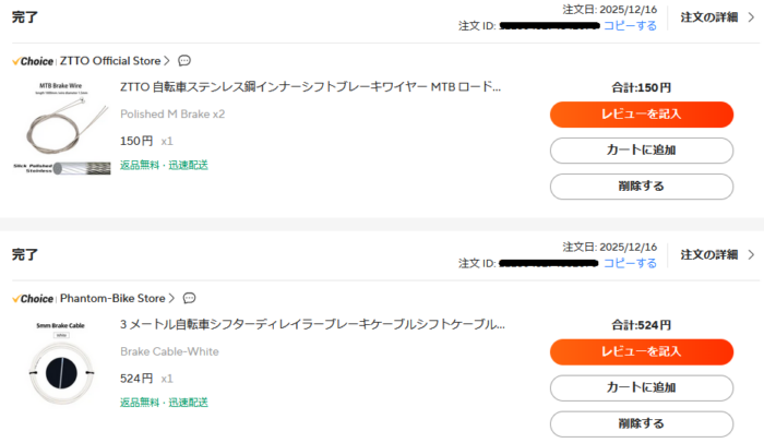 セールで2本で150円で送料無料のインナーケーブルを見つけた。