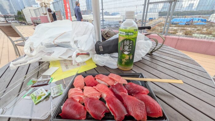 途中にマグロを売っている店で、ミナミマグロの中トロと赤身の握り寿司があった。