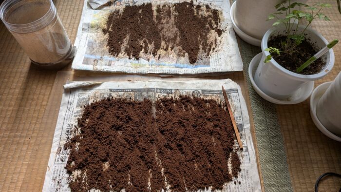 今朝は、こんなにコーヒーかすが出て広げがいがあった。(下段)
