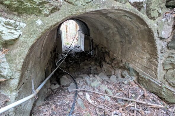 湧き水から延びている橋の下に降りて、黒いホースをみたら、トンネル内で下側に延びているホースと同じ色のホースに接続されていた。