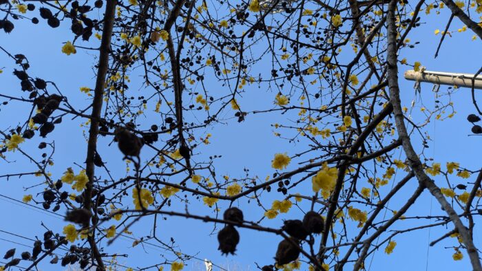 黄色い花の数と同じくらい前年の実が真っ黒になったのがついている。