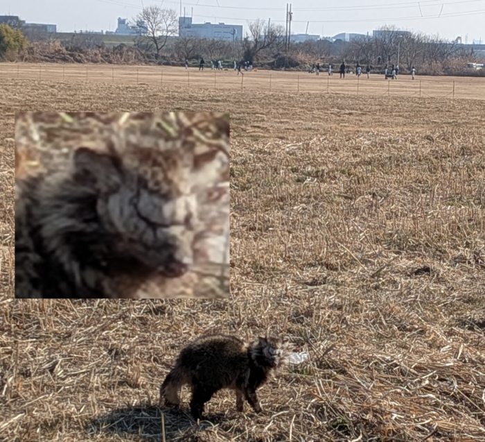 笹目橋過ぎて、河川敷グランドの端に出来た水溜まりで水を飲んでるタヌキを見つけた。