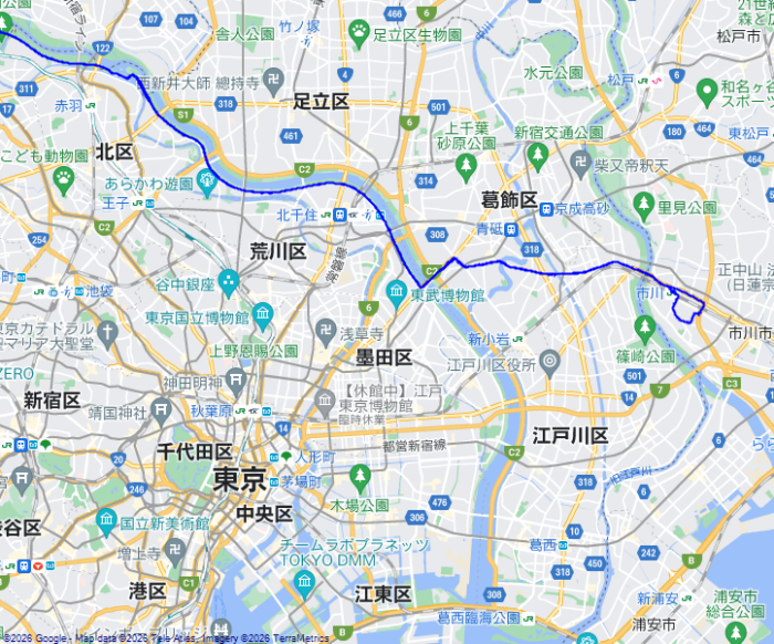 四ツ木橋で荒川を渡って、奥戸街道を通って、市川橋で江戸川を渡って千葉県に入った。