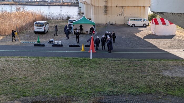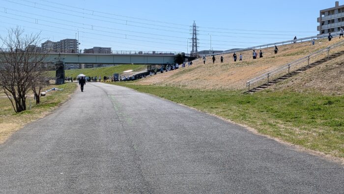 13kmぐらい走った後だったか警備員がいて、土手の上に迂回しろと言われて、