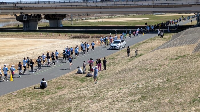 北千住辺りで、止められて、まだマラソン終わってないので、土手の上へ行くように言われた。