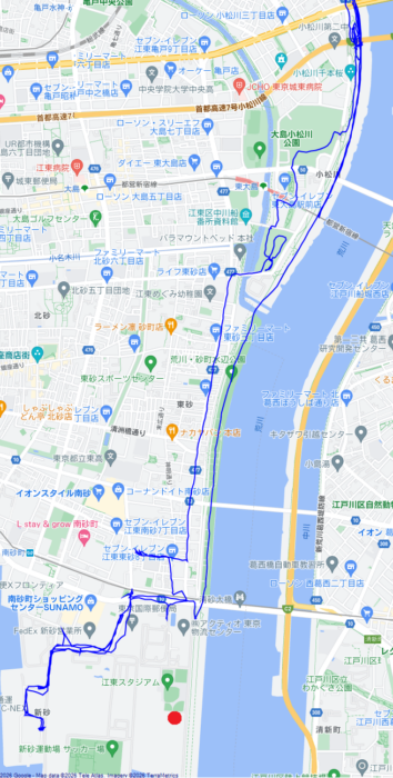 しばらく走ったが、やっぱり、土手の上に迂回するように言われて距離計測終了