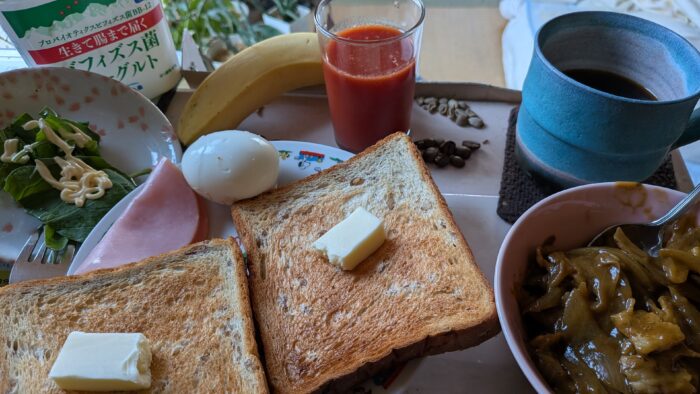 昨日焙煎したトラジャコーヒーをドリップして、カレーを再加熱した。