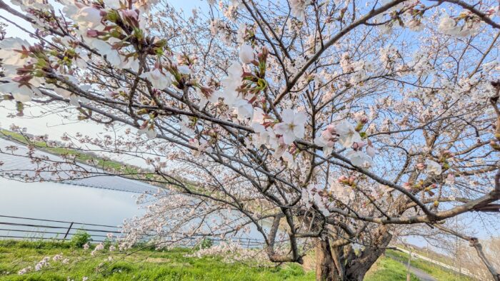 川島町の比企自転車道の太陽発電パネルが浮かんでる貯水湖の桜を通ってみた。