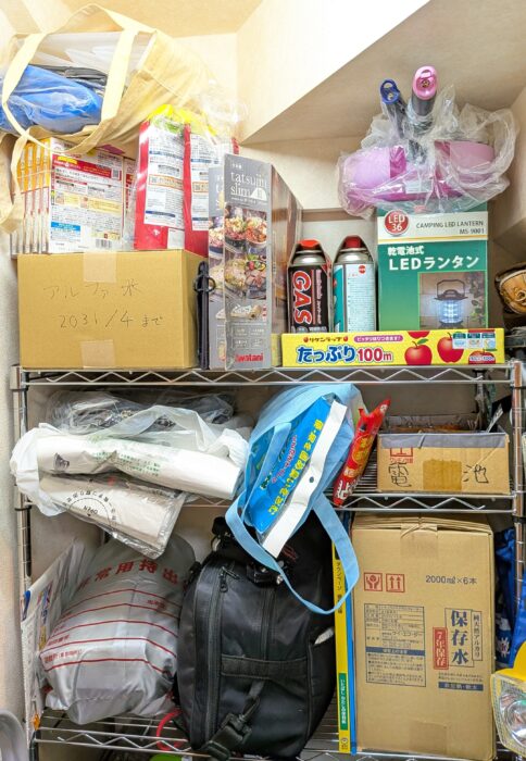 玄関近くの納戸に水ボトルバッグ、CB管、ガスコンロ、ランタン、ラップ、