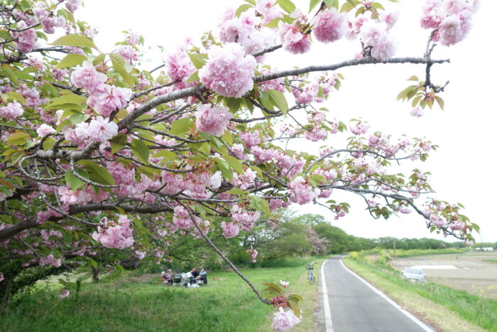ソーラーパネルが浮いた貯水池の近くの桜並木のソメイヨシノは花びらは完全に無くなっているが、